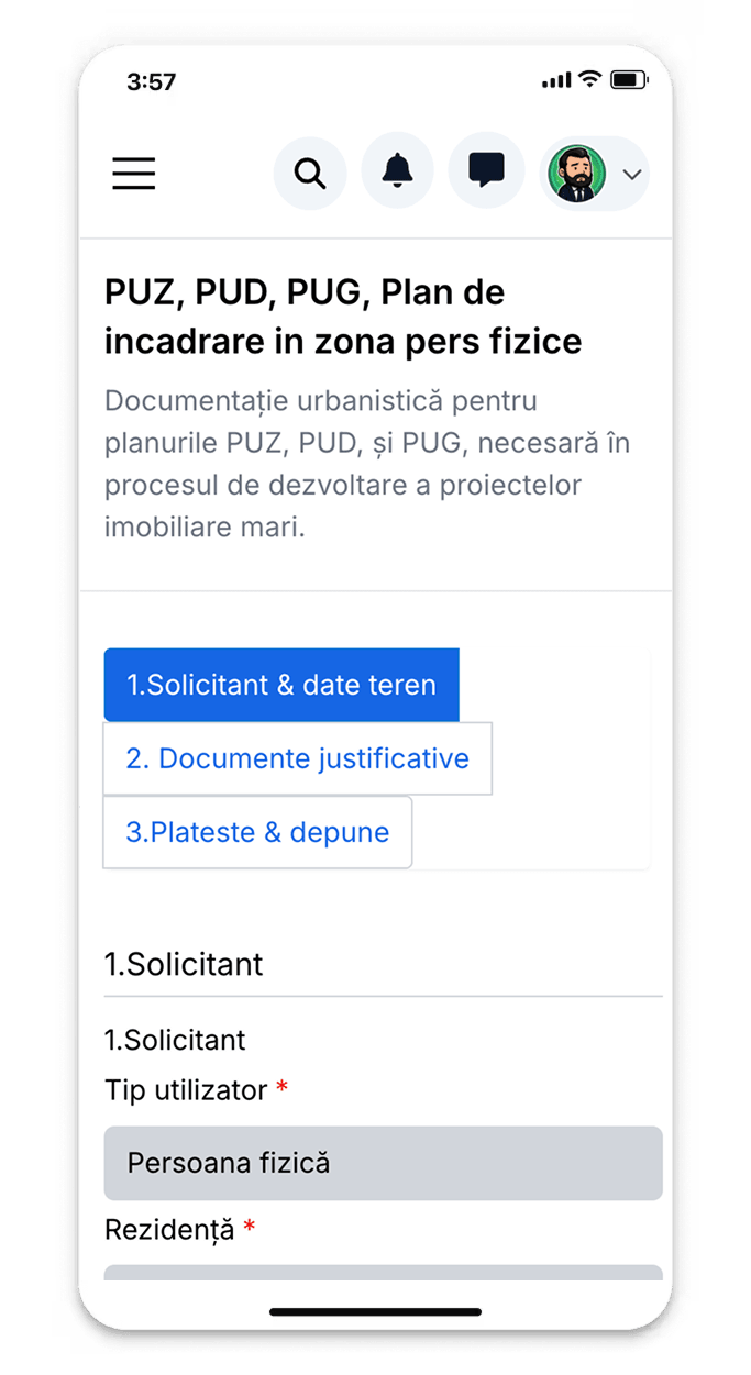 Loghează-te în platformă și accesează 'certificate urbanism'. Alege tipul de certificat necesar: informare, autorizare construire, desființare, dezmembrare. Formularul se va adapta automat.